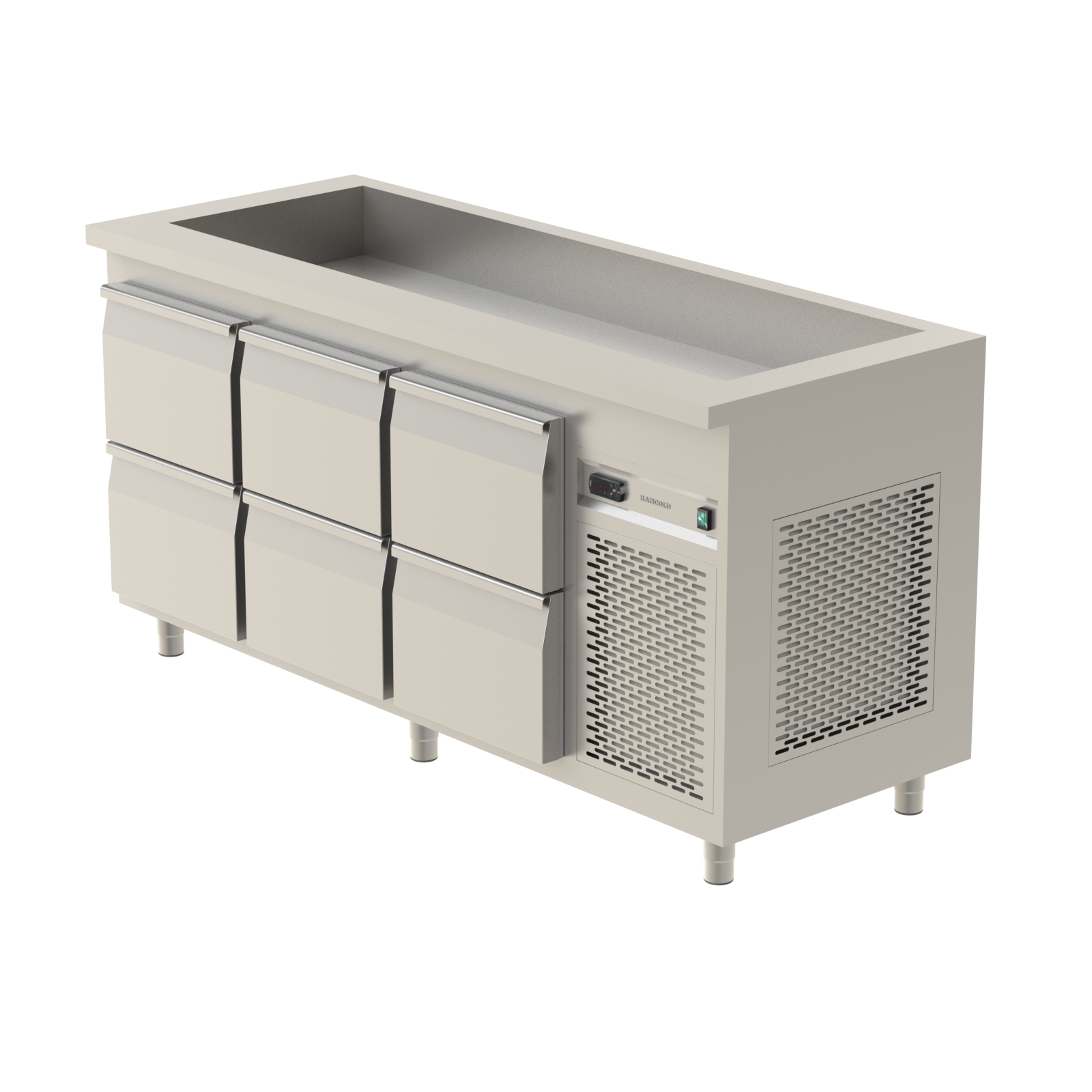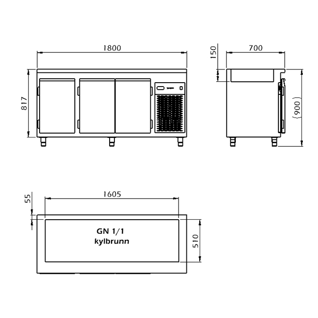 - Toppskivan förses med en kyld brunn anpassad för 1/1 GN-kantiner.