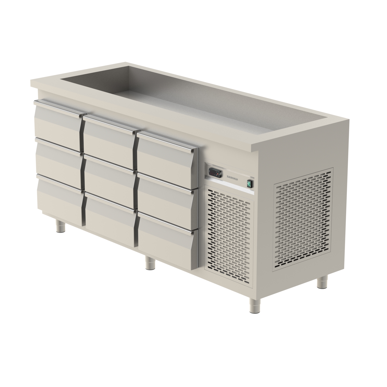 • Toppskivan förses med en kyld brunn anpassad för 1/1 GN-kantiner.