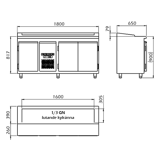 - Toppskivan förses med en kyld ränna anpassad för 1/3 GN-kantiner.