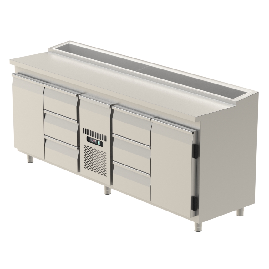 - Toppskivan förses med en kyld ränna anpassad för 1/6 GN-kantiner.