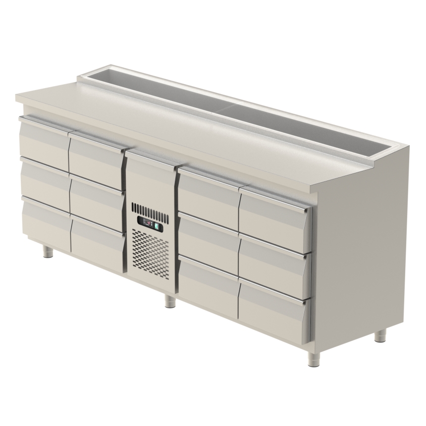 - Toppskivan förses med en kyld ränna anpassad för 1/6 GN-kantiner.
