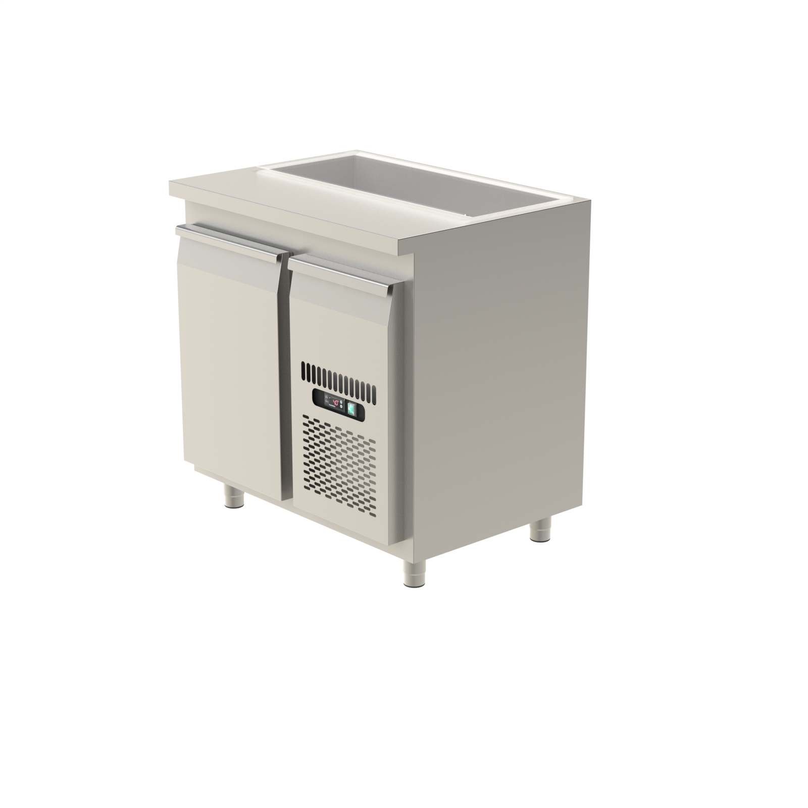 - Toppskivan förses med en kyld ränna anpassad för 1/3 GN-kantiner.